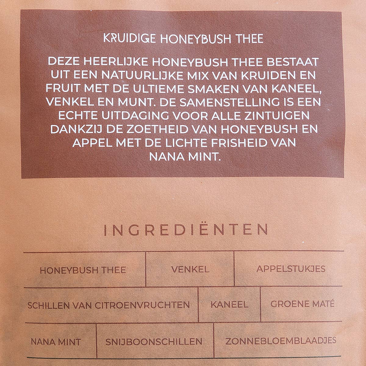 - Kruidige Honeybush Thee – Honeybush thee, venkel, appelstukjes, schillen van citroenvruchten, kaneel, groene maté, nana mint, snijboonschillen, zonnebloemblaadjes.